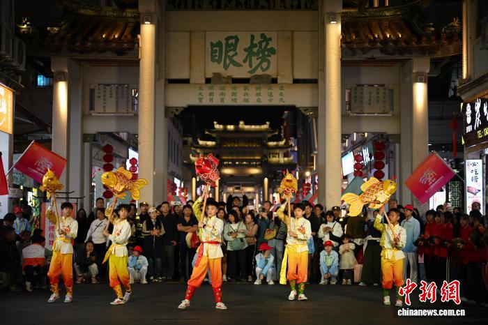 11月29日,潮州牌楼街启铺鲤鱼舞演出接待国内中潮籍城亲。中新社记者 旧楚白 摄